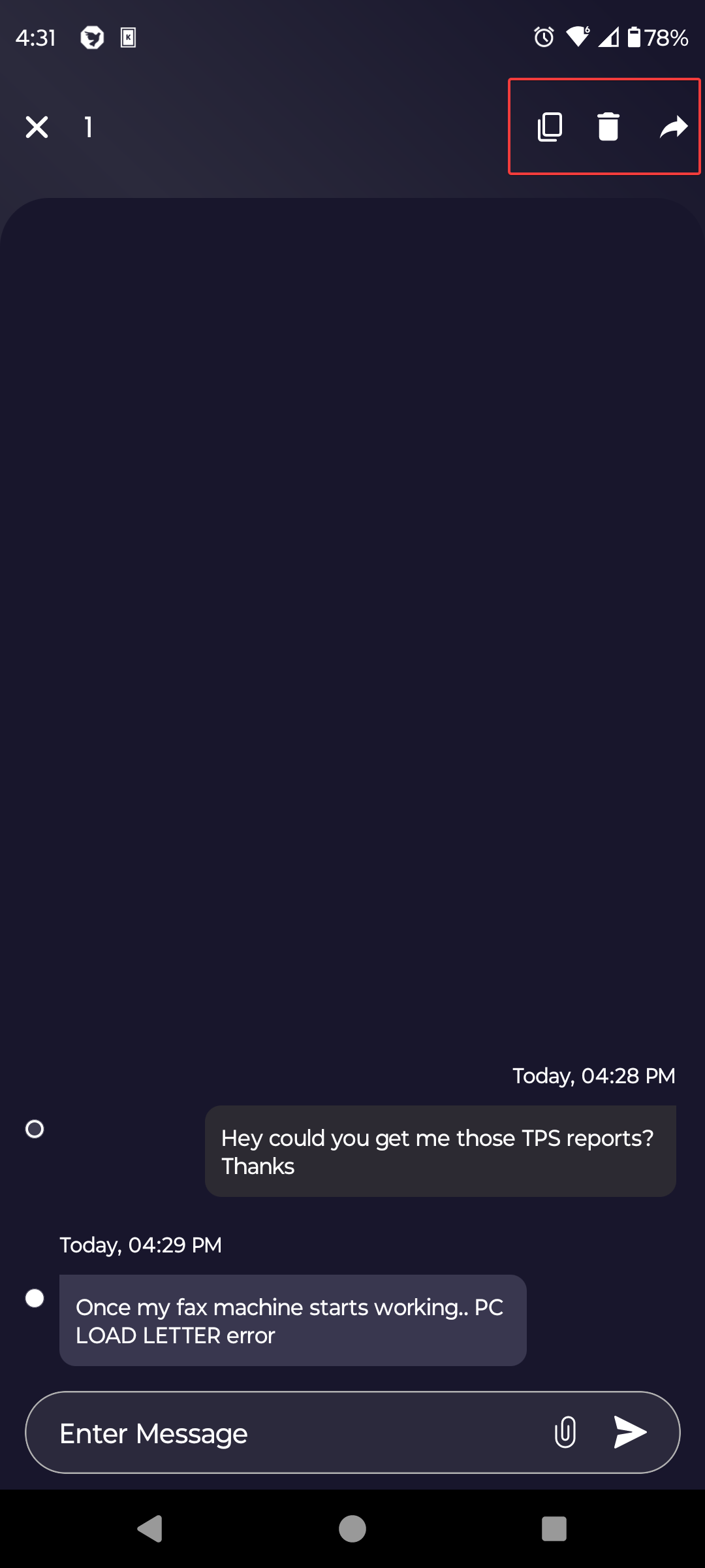 - Long-pressing on any message will reveal quick action icons at the top navigation bar.