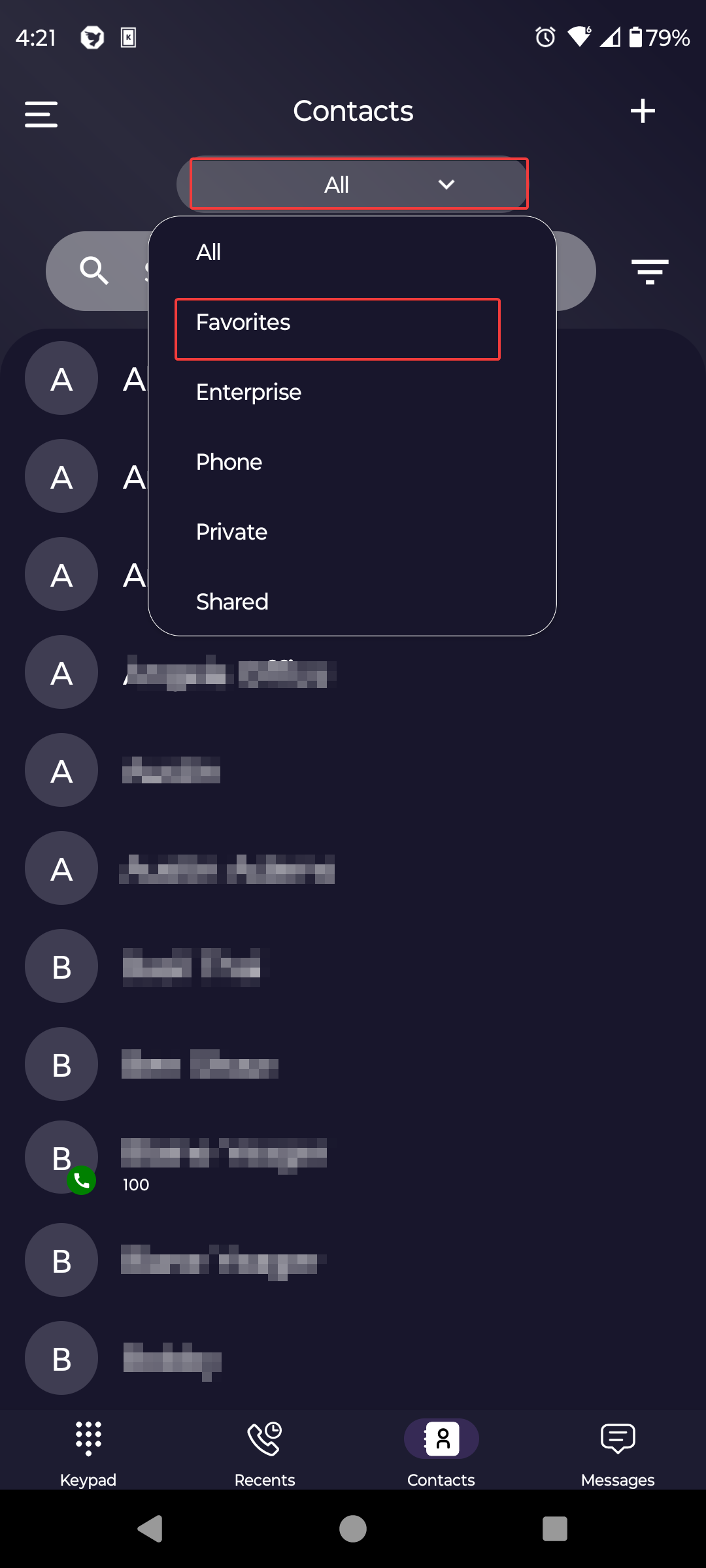 - In the Contacts tab, use the dropdown menu at the top to filter by Favorites.